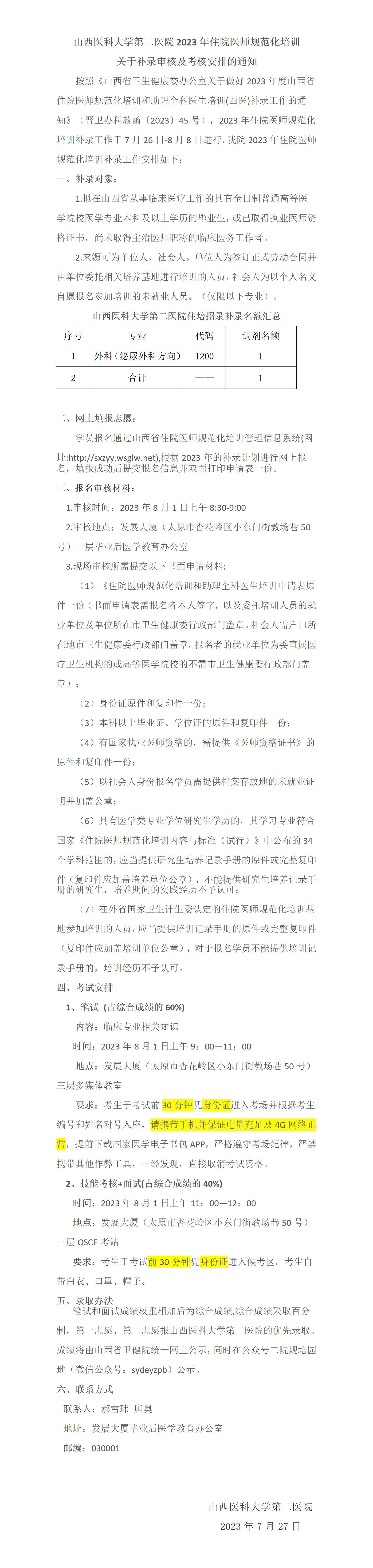 山西医科大学第二医院2023年住院医师规范化培训 关于补录审核及考核安排的通知