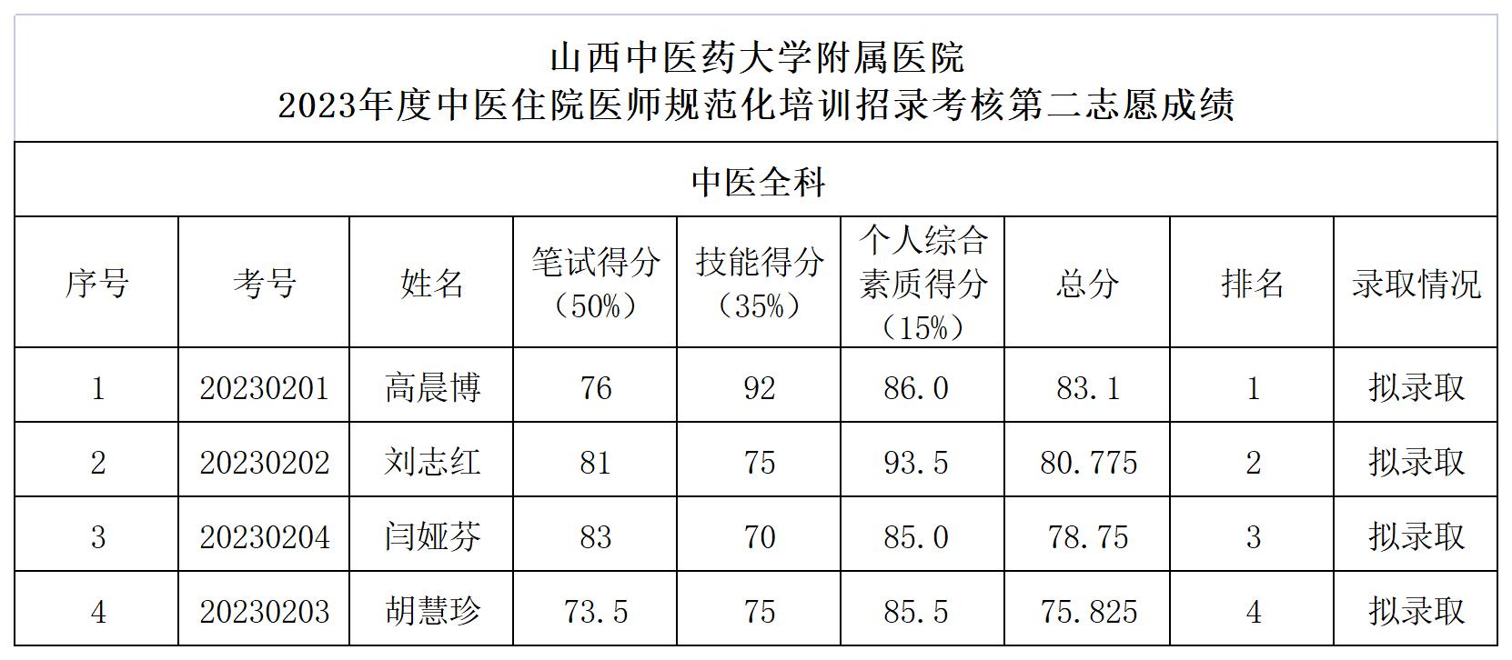 山西中医药大学附属医院2023年度中医住院医师规范化培训招录考核第二志愿成绩